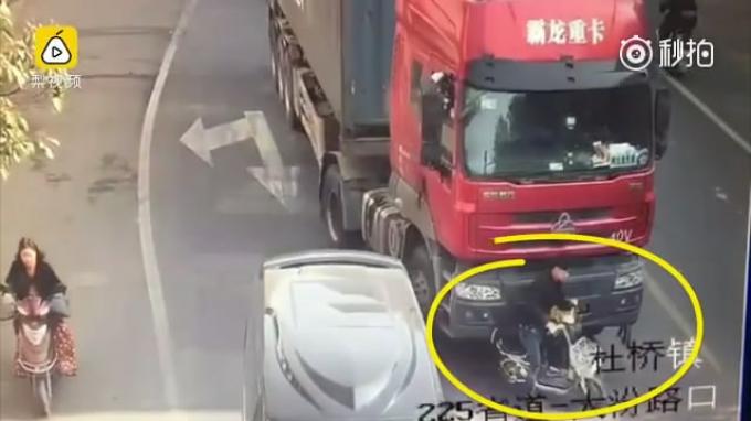 Seorang pengendara sepeda listrik nyaris tewas terlindas sebuah mobil truk saat melintas di sebuah jalan raya kota Zhejiang, Cina, pada Sabtu (4/3/2017).