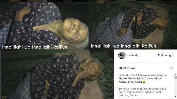Dalam unggahannya Cak Budi menulis, "Innalillahi wa Innailahi Roji'un, TELAH MENINGGAL DUNIA MBAH KADIYEM MADIUN. (emoji)