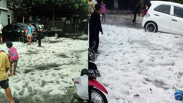 Pasca hujan deras dan angin kencang, warga dikejutkan dengan berserakannya butiran es di jalanan.
