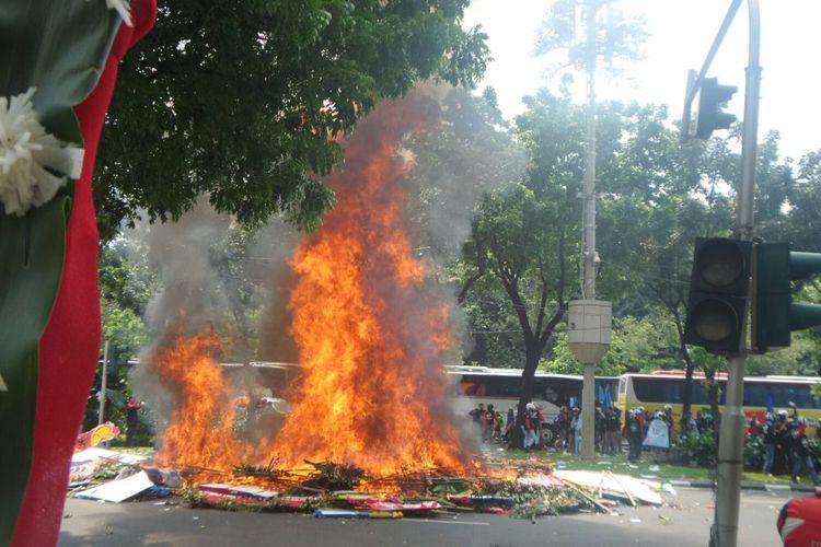Mereka membakar karangan-karangan bunga itu, karena dianggap memenuhi pagar kawasan Monas dan telah mengotori ibu kota.