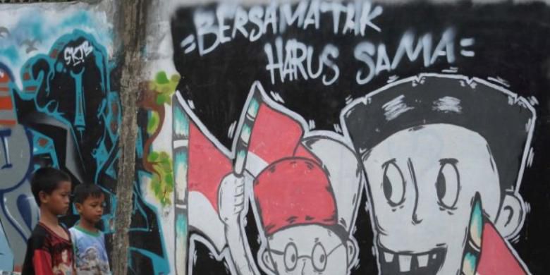 Warga melintas di dekat mural yang menyuarakan semangat kebersamaan dalam perbedaan di Jalan Kramat Jaya Baru, Jakarta Pusat, Senin (31/3/2014). Mural tersebut menjadi media bagi warga sekitar untuk menjaga kerukunan dan kedamaian di tengah perbedaan suku, agama, warna kulit, dan jender.