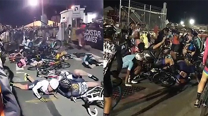 Pada video terlihat puluhan pebalap terlibat kecelakaan yang mengerikan.