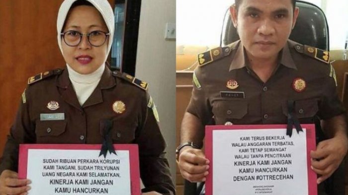 Seorang jaksa berfoto sambil memegang sebuah kertas dengan tulisan "Kami terus bekerja walau anggaran terbatas. Kami tetap semangat walau tanpa pencintraan. Kinerja kami jangan kamu hancurkan dengan #OTTRecehan".