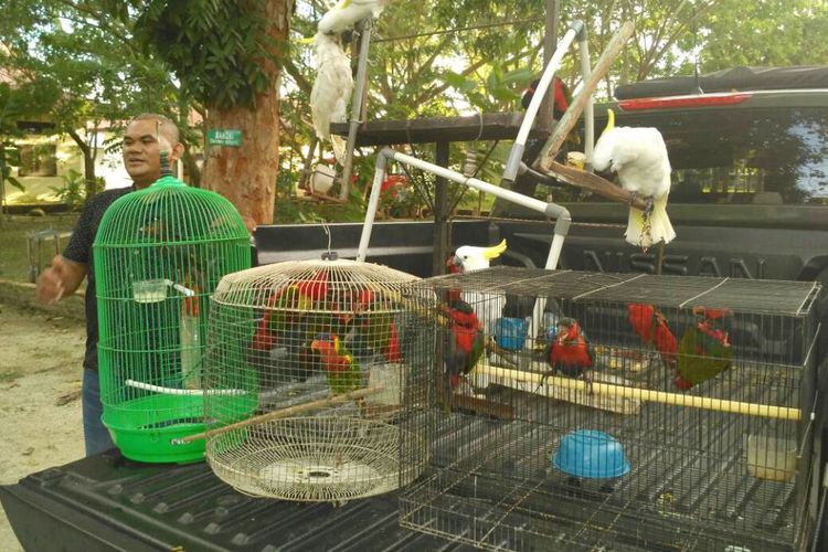 Barang bukti yang berhasil disita pihak yang berwenang terdiri dari 3 ekor kakatua besar jambul kuning (Cacatua galerita), 1 ekor kakatua kecil jambul kuning (Cacatua sulphurea), 7 ekor nuri kepala hitam (Lorius lory), 1 perkici dora (Trichoglossus haematodus), dan 3 ekor nuri ternate (Lorius garrulous).