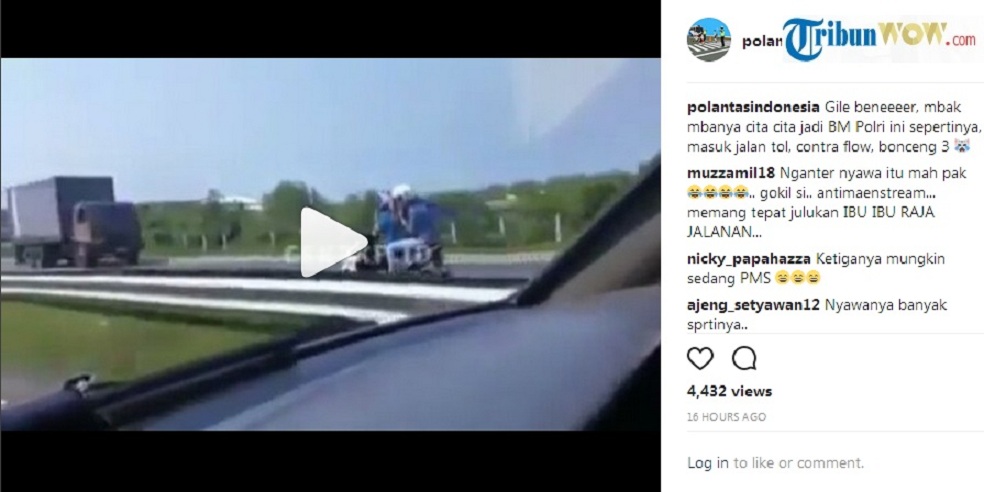 "Gile beneeeer, mbak mbanya cita cita jadi BM Polri ini sepertinya, masuk jalan tol, contra flow, bonceng 3 ," demikian tulis akun @polantasindonesia beri keterangan pada postingan video tersebut.