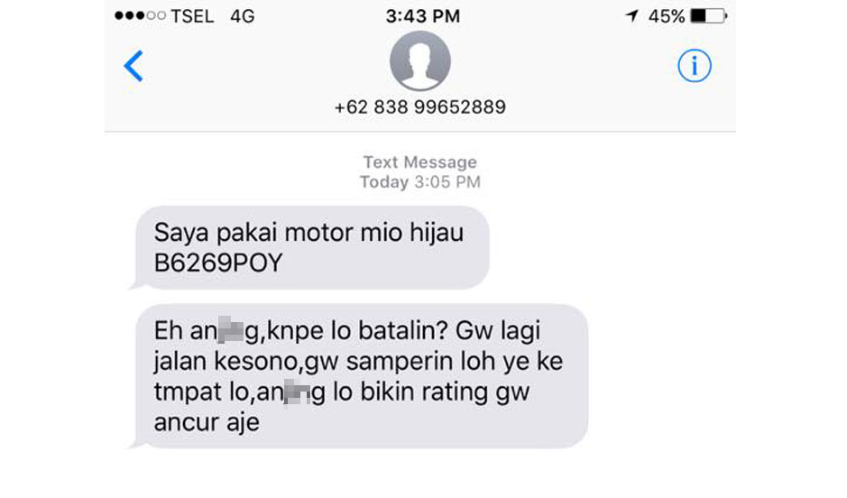 "Eh anj**g, kenape lo batalin? Gw lagi jalan ke sono, gw samperin loh ye ke tempat lo, anj**g lo bikin rating gw ancur aje," tulis pengemudi ojek berbasis aplikasi.