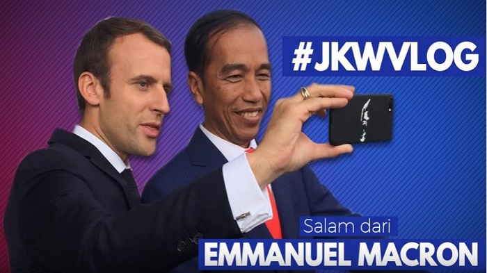 Presiden RI Joko Widodo (Jokowi) nge-vlog bareng Presiden Perancis, Emmanuel Marcon dan menyampaikan salamnya untuk masyarakat Indonesia.
