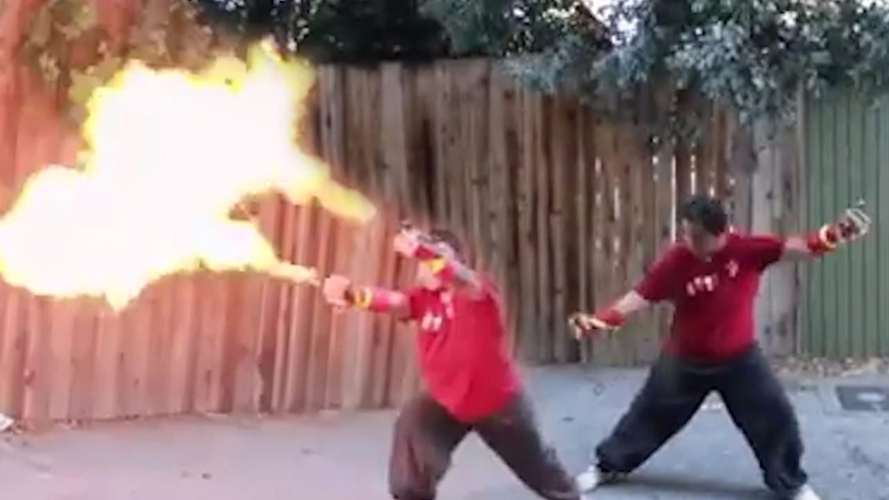 Dalam rekaman tersebut tampak seorang pria mempraktikkan gerakan bela diri sambil menyemburkan api.