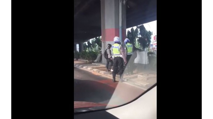 Pria tersebut pun tampak didampingi oleh dua petugas Polantas.