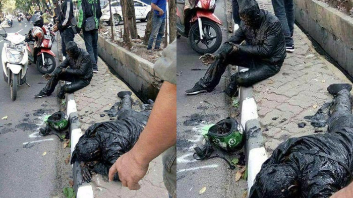 Dalam foto itu, terlihat dua orang--salah satunya driver ojek online--berada di trotoar dengan sekujur tubuhnya berlumur air got yang hitam.