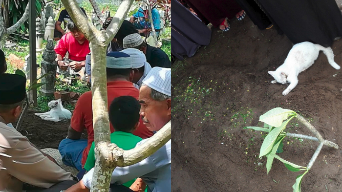 Ada seekor kucing berbulu putih ikut ke pemakaman dan tidak mau meninggalkan kuburan itu.