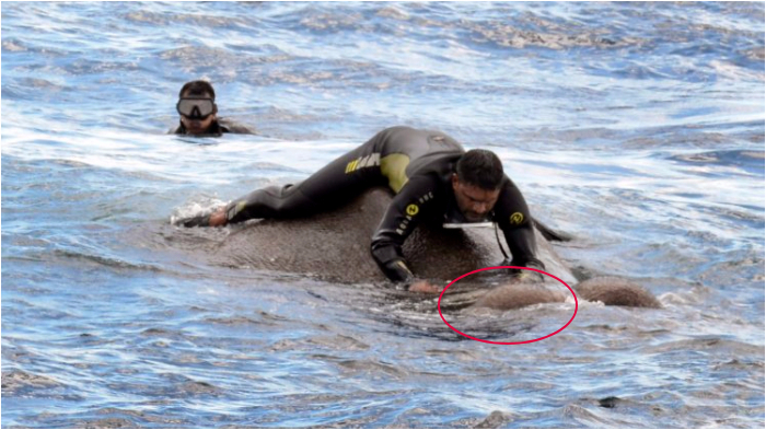 Penyelam mengikat tali ke gajah itu, lalu dengan perlahan perahu menariknya ke perairan dangkal di dekat pantai, tempat dia dilepaskan.