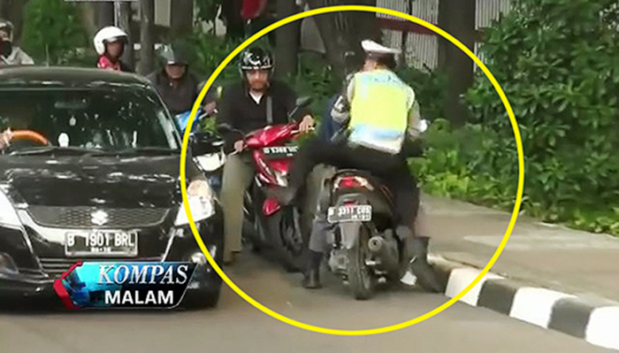 Polisi pun menggelandang dua pengendara yang berboncengan itu ke pinggir jalan.