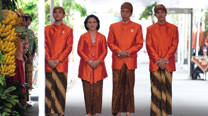 Kain jarik warna cokelat pun dikenakan keluarga Jokowi.
