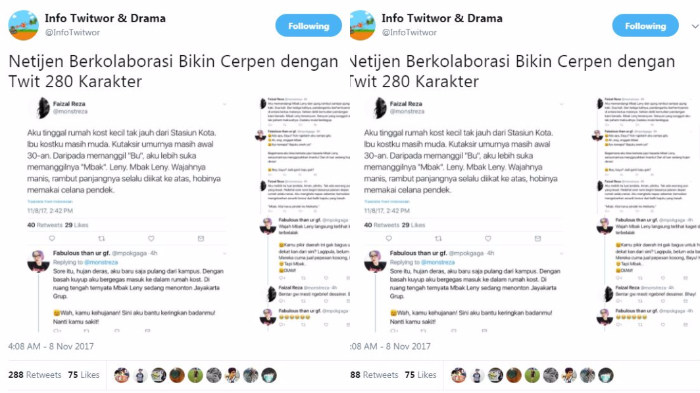 "Netijen Berkolaborasi Bikin Cerpen dengan Twit 280 Karakter," tulis akun tersebut.