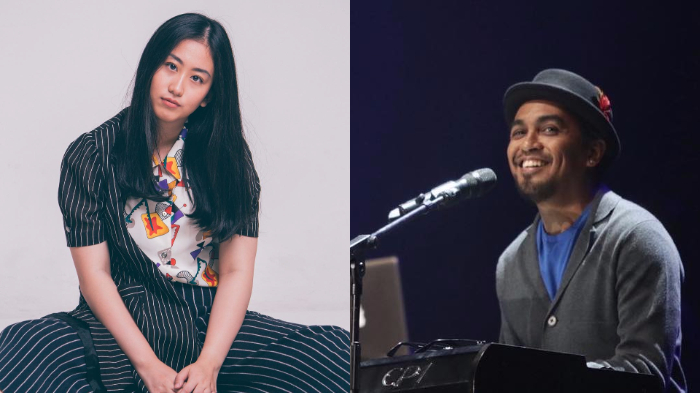 Gadis berambut panjang tersebut menutupi sebagian mukanya namun tampak Glenn Fredly duduk di sampingnya.