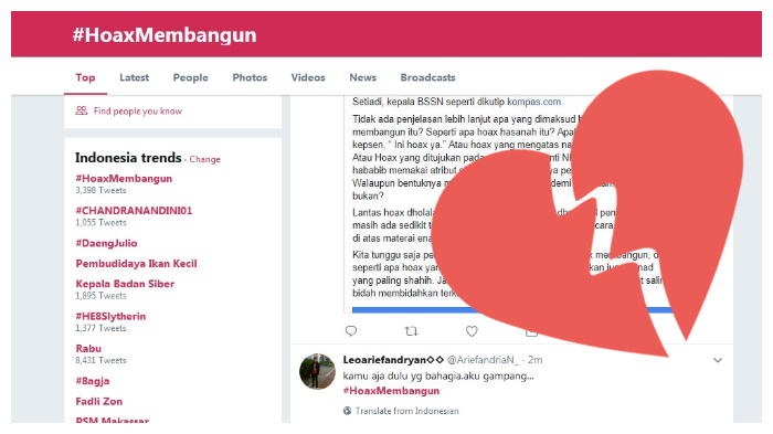 Hingga berita ini diturunkan, di twitter terdapat sejumlah 3.398 tweet yang menggunakan tagar #HoaxMembangun. Uniknya, terdapat kicauan netizen baper