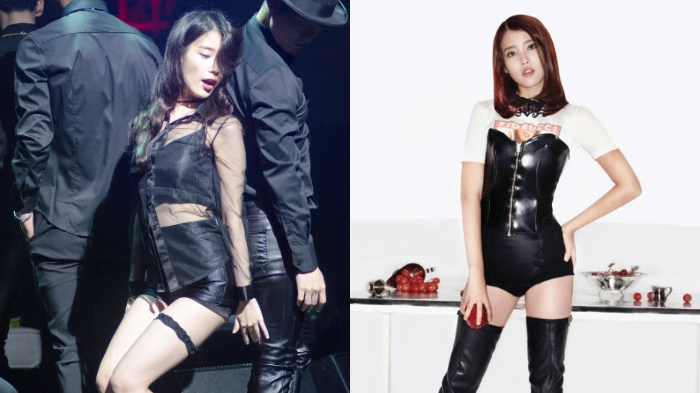 4. IU tampil garang dengan atasan bustier dari kulit yang dipadukan dengan kaus dan leather boots.