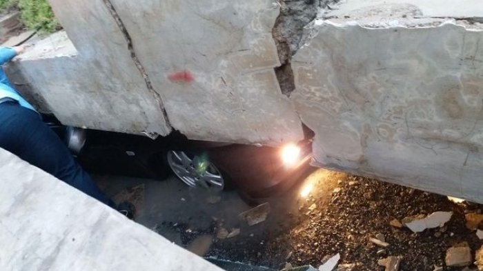 Terlihat beton pembatas di pinggir jalan ambruk dan langsung menimpa mobil.