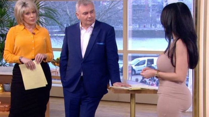 Seorang pecandu operasi plastik memilih untuk tidak duduk saat wawancara di TV karena takut implannya pecah.