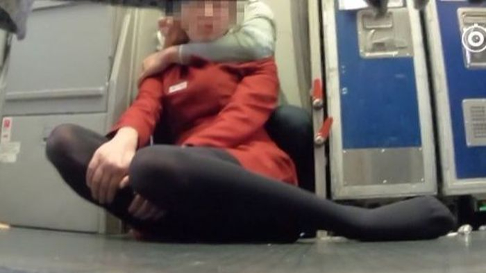 Sementara di bagian lain video lain memperlihatkan seorang pramugari duduk di lantai pesawat di dekat lemari penyimpan makanan.