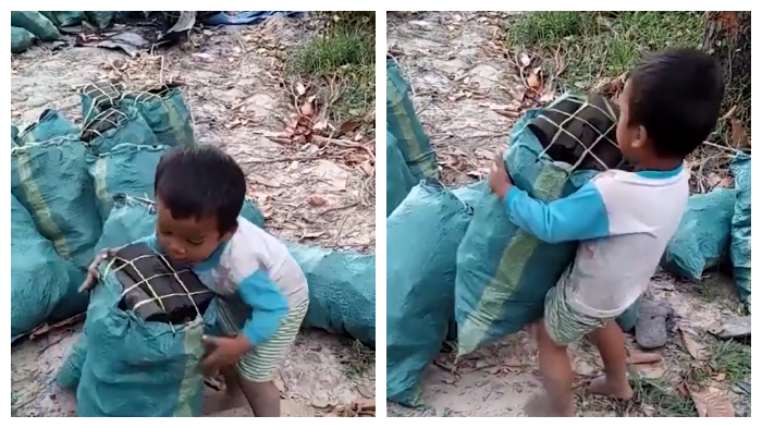 Sebuah video yang beredar di media sosial Facebook memperlihatkan bocah tersebut bekerja mengangkat karung berat.