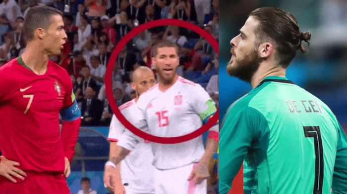Sambil berjalan di belakang Ronaldo, Ramos memanggil David de Gea dan memberikan kode menggunakan kepalanya.