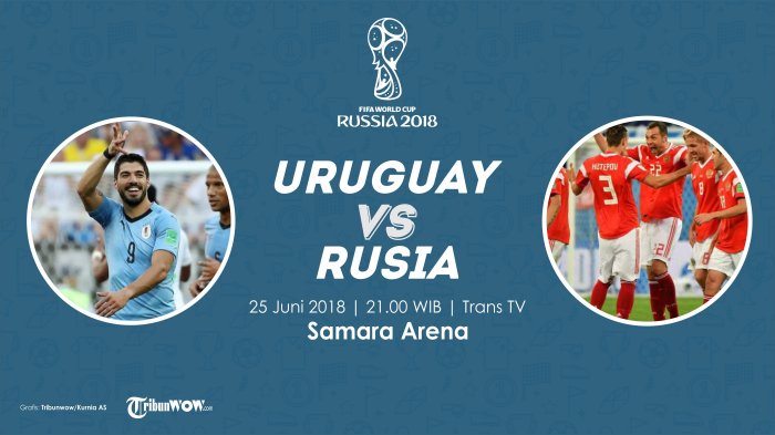 TRIBUNWOW.COM - Timnas Uruguay akan menghadapi timnas Rusia dalam laga terakhir penyisihan Grup A Piala Dunia 2018 di Samara Arena, Senin (25/6/2018) malam.