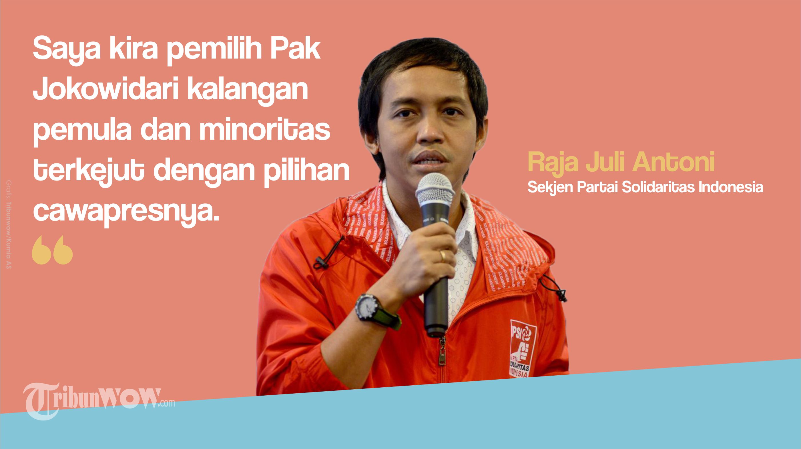 TRIBUNWOW.COM - Sekjen Partai Solidaritas Indonesia (PSI) Raja Juli Antoni menilai wajar jika elektabilitas Joko Widodo turun karena memilih Ma'ruf Amin sebagai calon wakil presiden.