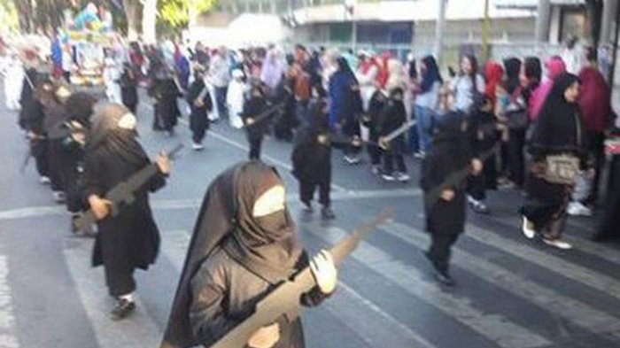 Pada karnaval tersebut ada kelompok peserta yang menggunakan atribut mainan senjata laras panjang dan cadar hitam.