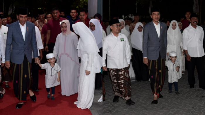 Penampilan presiden semakin lengkap dengan songkok hitam dan sendal warna senada.