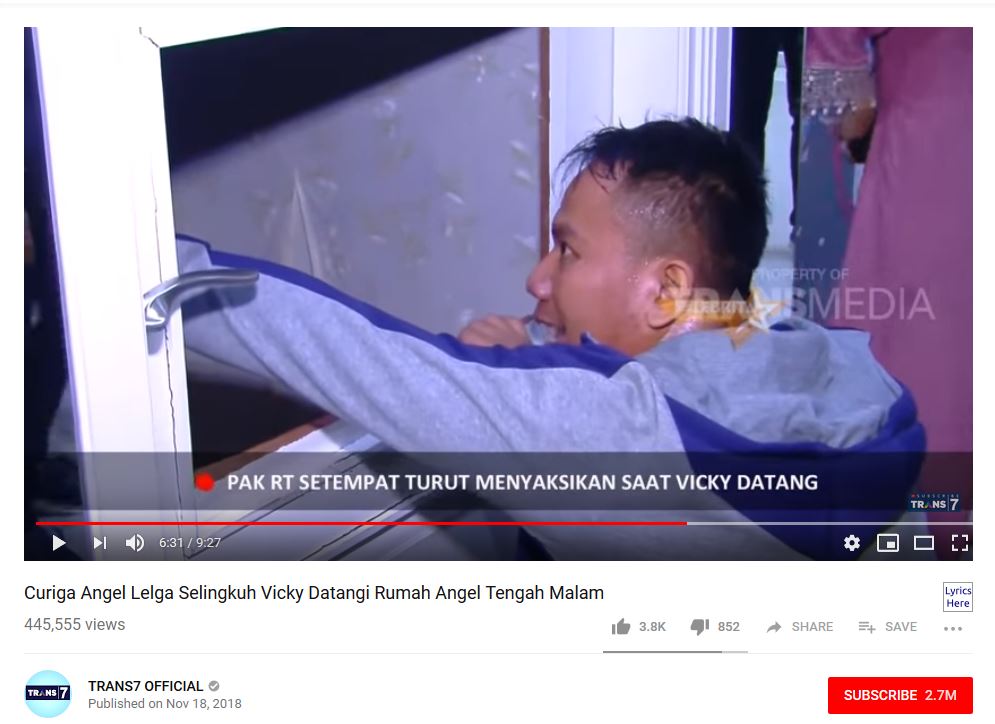 "Saya lihat pakai mata kepala saya sendiri didampingi teman dan sejumlah media mereka merekam juga. Si cowo itu langsung lari ke kamar mandi pakai celana pendek, sementara Angel langsung bergegas mengenakan penutup kepala," sambung Vicky.