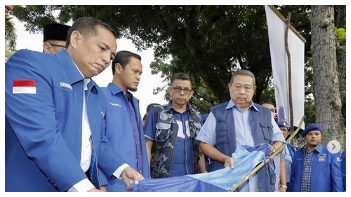 Presiden keenam RI tersebut mengelus-elus dadanya melihat kondisi atribut partainya rusak parah.