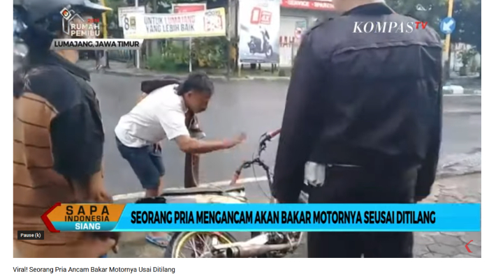 Seorang pria mengancam polisi akan membakar motornya karena tak terima ditilang. (Capture Youtube KompasTV)
