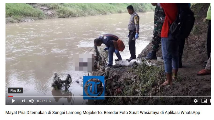 TRIBUNWOW.COM - Jasad Harianto (26) warga Kecamatan Dawarblandong, Kabupaten Mojokerto ditemukan tewas mengambang di sungai, Kamis (14/3/2019).