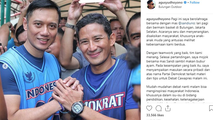 "Pagi ini saya berolahraga bersama dengan mas @sandiuno; lari pagi dan bermain basket di Bulungan, Jakarta Selatan," tulis AHY di laman Instagramnya, @agusyudhoyono, Minggu siang.