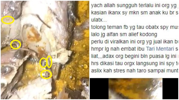 Dalam keterangan video, akun tersebut menulis, “Yach Allah sungguh terlalu ini orang yang jual ikan berulat begini,,1 ekor lalo mhe kasian ikanx saya makan sama anakku baru saya lihat ada ulatnya sampai muntahku juga ada ulatx......”