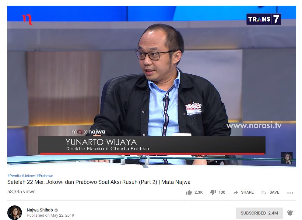 Direktur Eksekutif Charta Politika Yunarto Wijaya tanggapi pidato Calon Presiden Prabowo Subianto terkait kericuhan yang terjadi di Aksi 22 Mei.