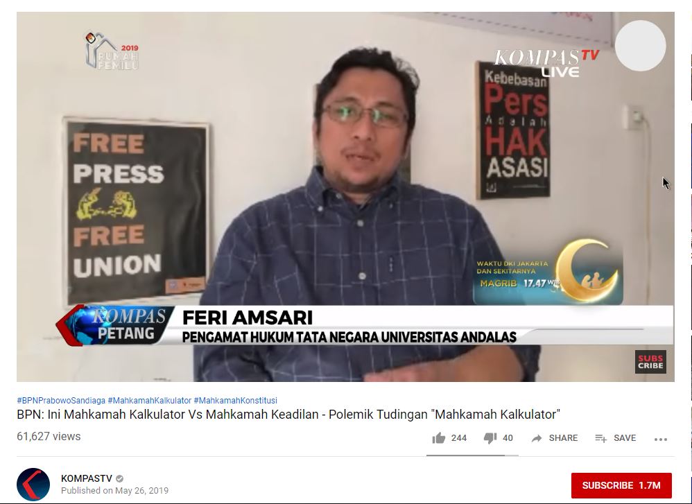 Pengamat Hukum Tata Negara Universitas Andalas, Feri Amsari memberikan tanggapan atas pernyataan Ketua Tim Hukum Prabowo-Sandi, Feri Amsari.