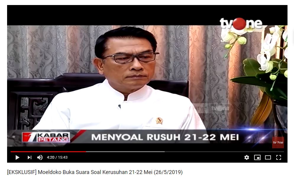 Hal tersebut diungkapkan Moeldoko saat menjadi narasumber dalam wawancara eksklusif Tv One, dikutip dari saluran Youtube tvOneNews, Minggu (26/5/2019).