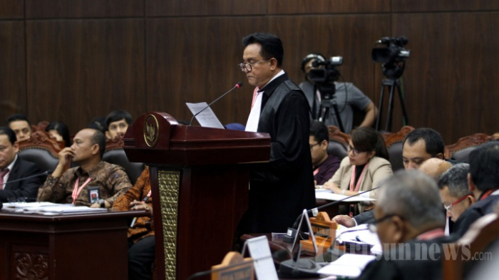 Ketua tim kuasa hukum pasangan Joko Widodo-Ma'ruf Amin, Yusril Ihza Mahendra menyampaikan eksepsi dalam sidang sengketa hasil Pemilihan Presiden (Pilpres) 2019 di Gedung Mahkamah Konstitusi (MK), Jakarta Pusat, Selasa (18/6/2019). Agenda persidangan adalah mendengar jawaban dari termohon dalam hal ini Komisi Pemilihan Umum (KPU), keterangan pihak terkait dalam hal ini Tim Kampanye Nasional (TKN), dan keterangan Bawaslu.