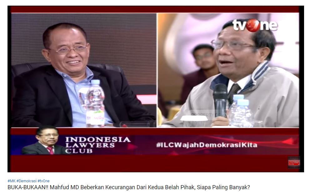 Mantan Ketua Mahkamah Konstitusi (MK) Mahfud MD memberikan kritikan kepada mantan Sekjen BUMN Said Didu yang menyebutkan para intelektual tak memberikan pembelaan, Selasa (2/7/2019) malam. (Capture Indonesia Lawyers Club)