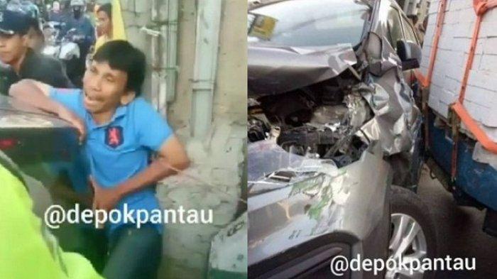 Seorang pria terjepit di antara mobil dan truk saat kecelakaan di Jalan Raya Sawangan, Depok, Jawa Barat pada Kamis (18/7/2019). Ini kronologinya.