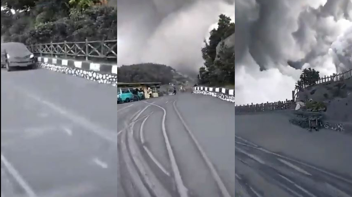 Dalam video yang diunggah akun @putrinaab, tampak seorang pengendara motor merekam situasi kepanikan di sekitar lokasi erupsi.