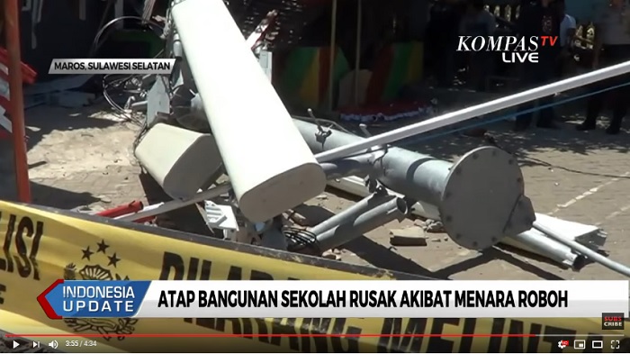 Sebuah menara milik operator seluler roboh menimpa bangunan Sekolah Dasar Negeri (SDN) Bado-Bado, Maros, Sulawesi selatan.