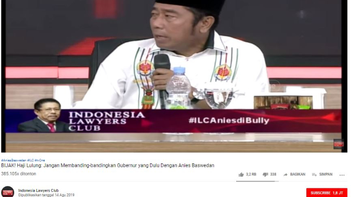 Hal itu disampaikan Haji Lulung saat menjadi bintang tamu di acara 'Indonesia Lawyers Club (ILC)' dengan topik #AniesdiBully pada Selasa, (13/8/2019).