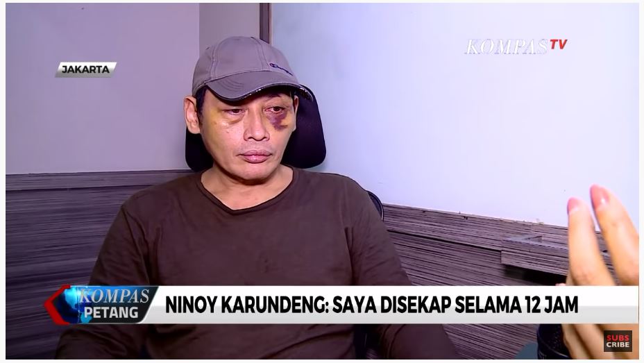 Ninoy yang juga merupakan relawan Joko Widodo saat Pilpres 2019 ini mengaku tiba-tiba diseret dan diinterogasi dan dianiaya selama dua menit.