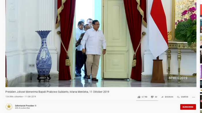 Lalu terlihat Prabowo masuk ke dalam ruangan Istana Merdeka melalui pintu bercat kuning.
