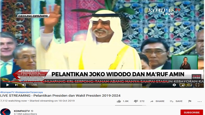Dilansir TribunWow.com dari tayangan live KompasTV, momen tersebut adalah ketika Ketua MPR Bambang Soesatyo menyapa para pimpinan dan utusan negara sahabat yang hadir, Minggu (20/10/2019).