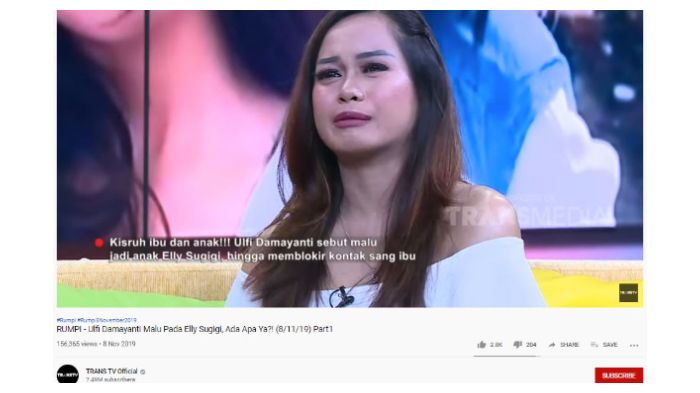 Momen tersebut terlihat saat Ulfi Damayanti menjadi bintang tamu di acara Rumpi yang tayang dan diunggah di channel YouTube TRANS TV Official, Sabtu (9/11/2019).